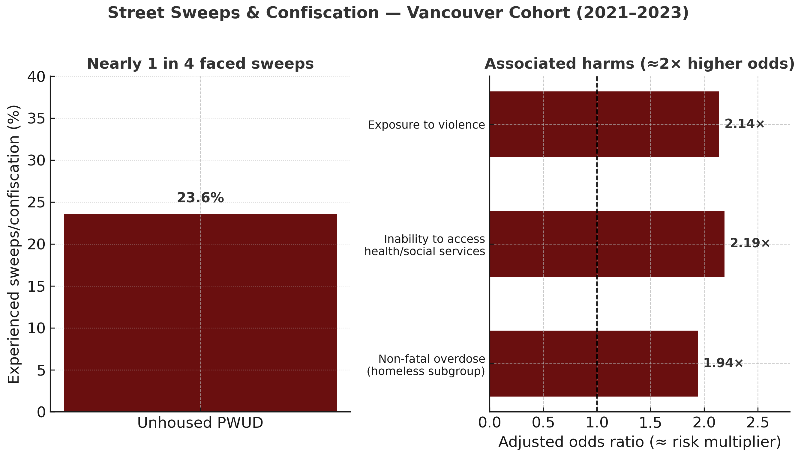 A 2023 cohort study in Vancouver found that nearly 24% of unhoused people who use drugs experienced sweeps involving confiscation of personal items, which was associated with nearly a 2x increase in overdose risk, an inability to access healthcare, and a significantly higher exposure to police violence.