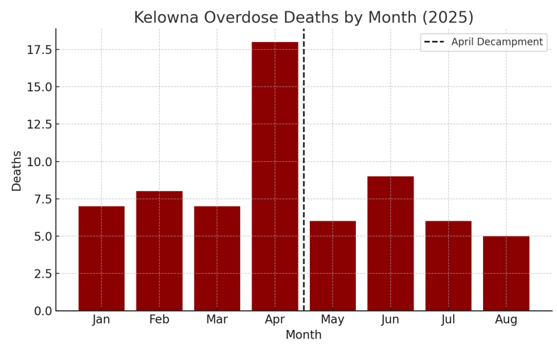 From January to August 2025, Kelowna recorded 66 overdose deaths — with a fatal spike in April, immediately after the decampment.