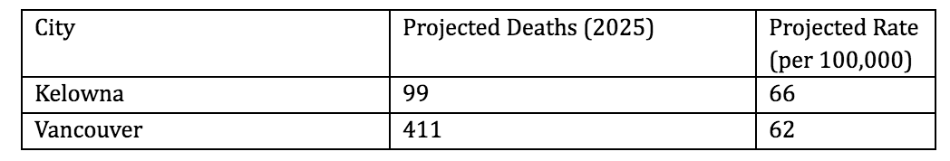 If current trends continue, Kelowna is projected to see 99 overdose deaths in 2025 — equivalent to a staggering 66 deaths per 100,000 people. Vancouver, long portrayed as the heart of the crisis, is on track for 411 deaths, or 62 per 100,000. Despite Vancouver’s larger population and higher total count, Kelowna’s per capita overdose mortality rate would be worse.